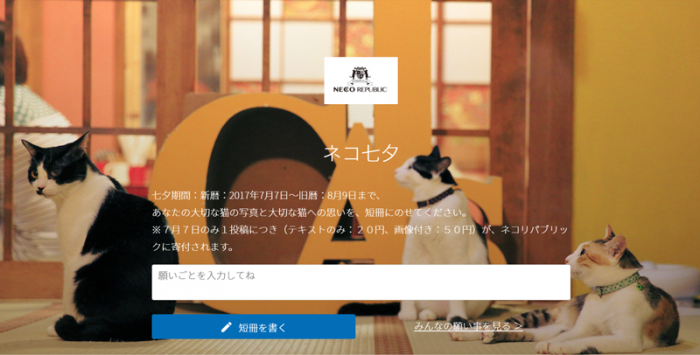 7月7日から8月9日まであなたが短冊に願いを込めて投稿するとスポンサー企業からネコリパに寄付される仕組みです